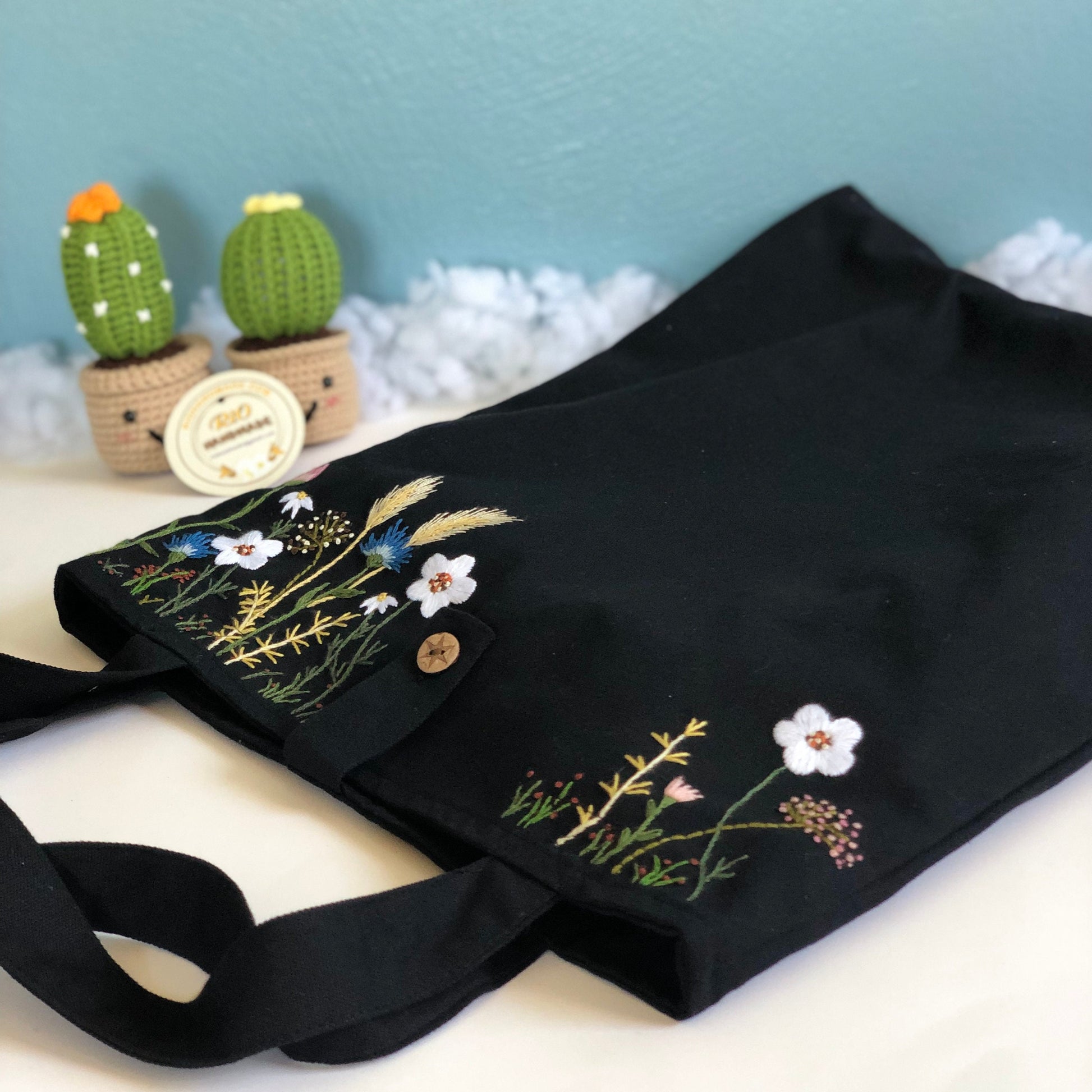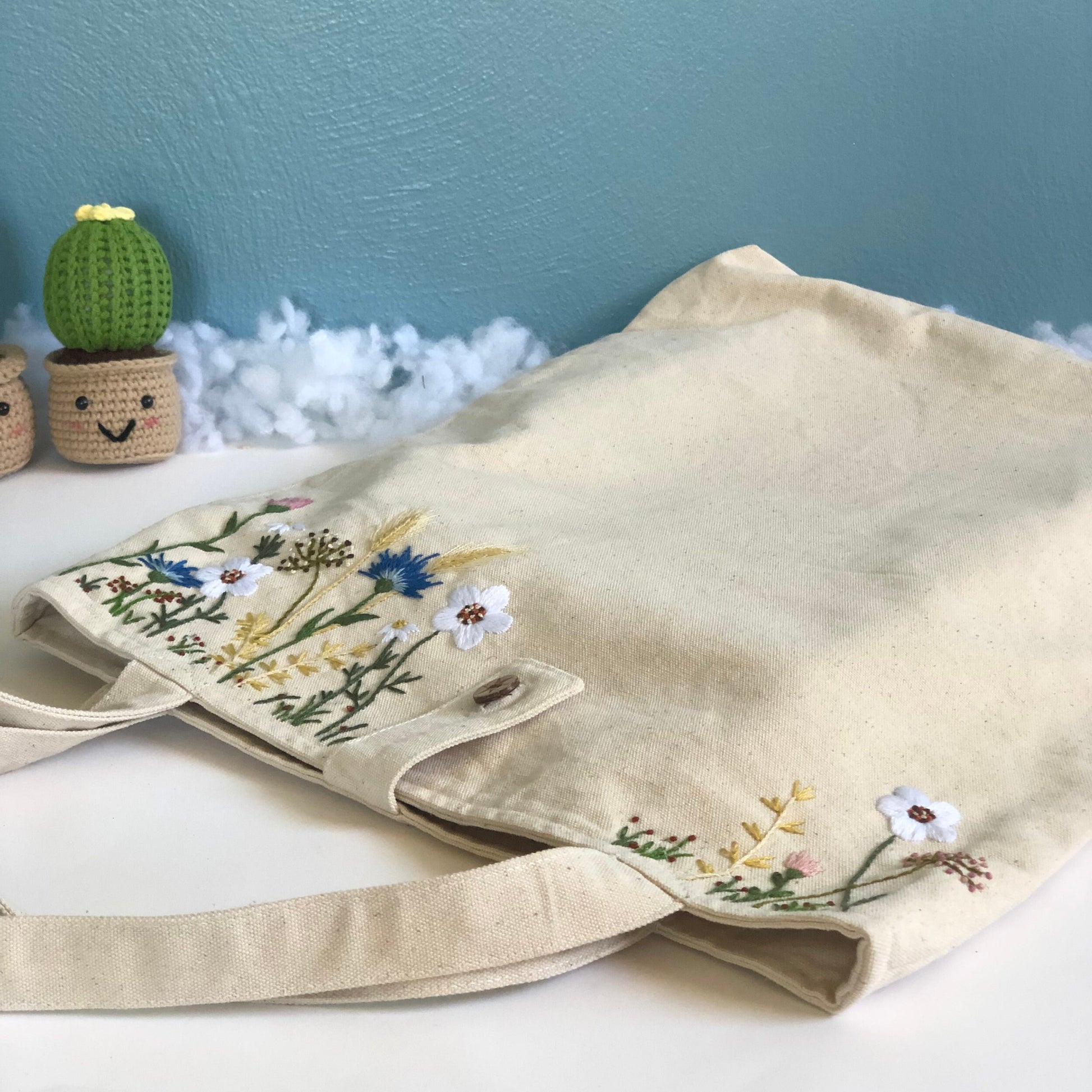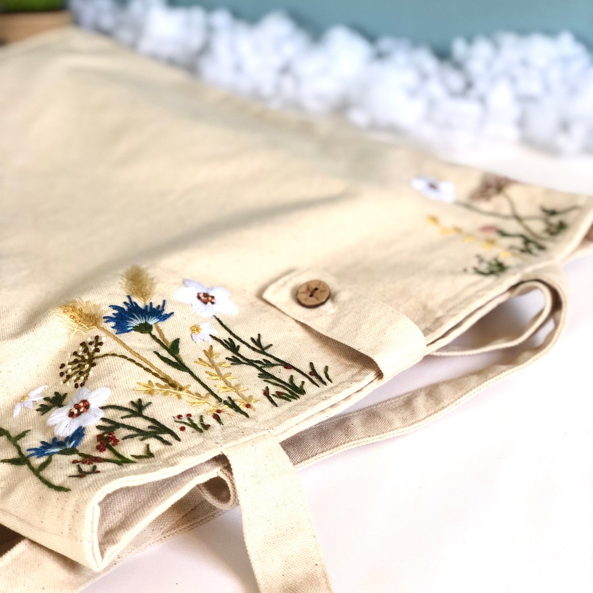 Handmade Embroidery Floral Linen Tote Bag Flowers